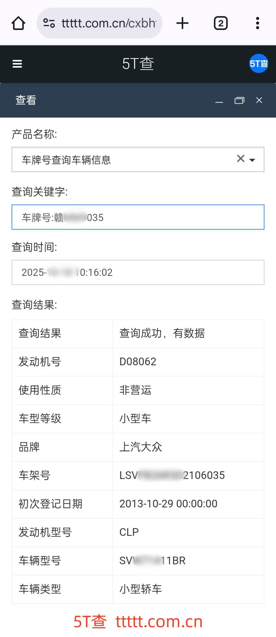 车牌号查询车辆信息,可通过输入车牌号快速查询车辆的核心信息,包括车辆型号、车架号、发动机号、发动机型号、登记时间、品牌、使用性质等。